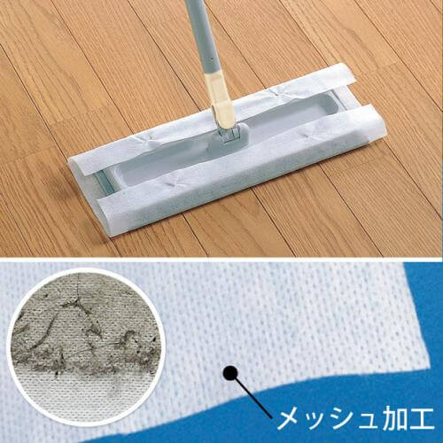 ホコリ・髪の毛をしっかり吸着できる着塵剤を使用。拭くだけで着塵剤とポリエステル繊維がホコリや髪の毛を吸着します。抗菌・防カビ剤を配合した良質な着塵剤を使用していますので、清掃面がベトベトしません。メッシュ構造で、ゴミをしっかりキャッチします。