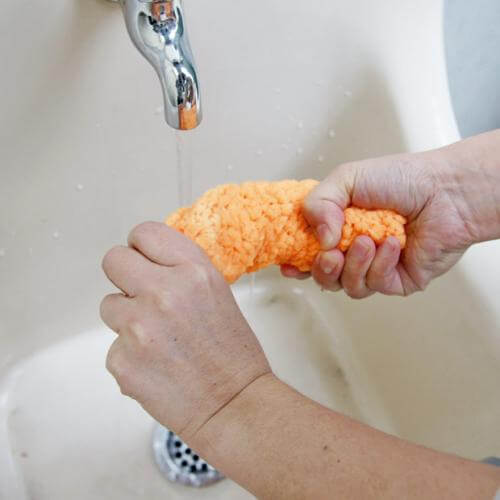 コシがあるスポンジが入っているので、握りやすく、手も疲れにくい形状です。洗って繰り返し使用できます。