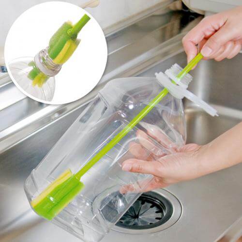 ペットボトルのような狭い口でも大丈夫 ! 直径約2cm以上に入ります。全長約40cmとロングタイプなので、2リットルのペットボトルの底もしっかり洗えます。柄が適度にしなるのでボトルの底だけでなく、内側の壁面や凸凹面にもスポンジがフィットします。