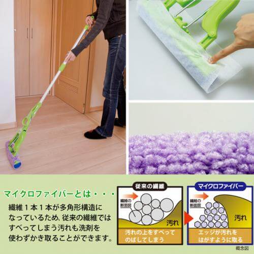 付属のマイクロファイバー製のダスターを取り付ければ、スポンジに含んだ水分がダスターに染み出て約25畳分の面積を一気に水拭きできます。広い面積を水拭きしたい方におすすめ。フローリング用使い捨てウェットシートを取り付けて使用することもできます。洗剤を使わず水だけで汚れを落とすことができます。