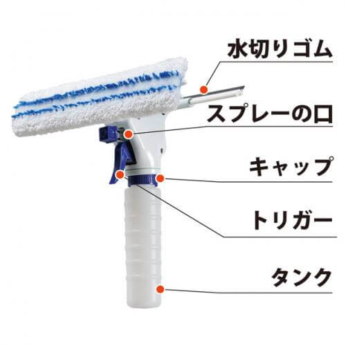 水道が近くに無い場合の窓掃除に最適。スプレー付きのガラスワイパーなので、ホース・バケツを使用することなく、手軽に窓ガラスの掃除をすることができます。仕上げの水切りはやわらかめのゴムが窓にピッタリ密着し、一気にできます。持ちやすくて軽いので、お子様のお手伝いにもおすすめです。