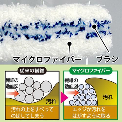 モップに「マイクロファイバー(極細繊維)」を使用。繊維1本1本が多角形構造になっているため、従来の繊維では滑ってしまう汚れも洗剤を使わずかき取ることができます。ブラシがこびりついた汚れをかき出し、マイクロファイバーが汚れをキレイに拭き取ります。