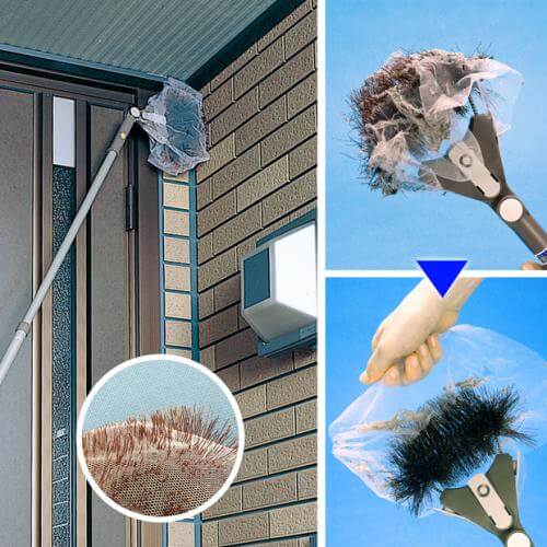 ブラシやほうきにシートを巻き付けることで、ブラシやほうきを汚さずシートから突き出したブラシがクモの巣をかき取ります。使用後はシートをはがすだけで取り除いたクモの巣が簡単に取れます。使用後のシートはそのままゴミ箱に捨てられるので、 お手入れがラクです。