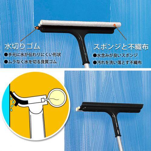 水含みが良いスポンジと汚れを洗い落とす不織布です。手元に水が伝わりにくい形状で、水切りゴムがムラなく水滴を拭き取り、美しい仕上がりに。