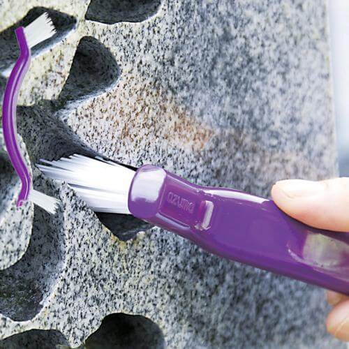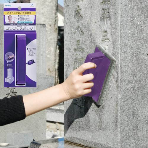 毛足の長いブラシ繊維が墓石やコンクリートの表面の凸凹に入り込んで汚れをかき出し、吸着繊維が浮いた汚れを拭き取ります。ソフトなブラシ繊維だから墓石を傷つけません。握りやすいグリップ付き。力が入れやすく、広い面もしっかりお掃除できます。