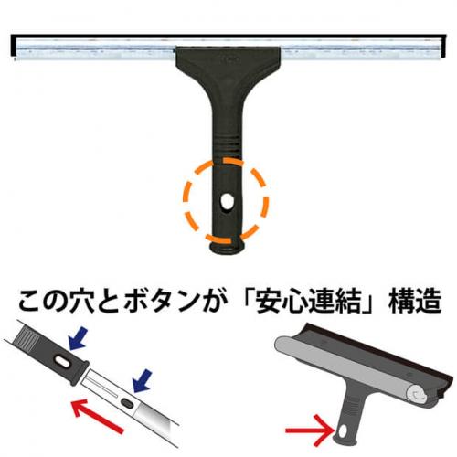 別売りの「三段伸縮柄(アルミ)LL553」または「安心連結」構造がついた柄に共通で取り付け可能です。 着脱はボタンを押して抜き差しするだけで簡単です。