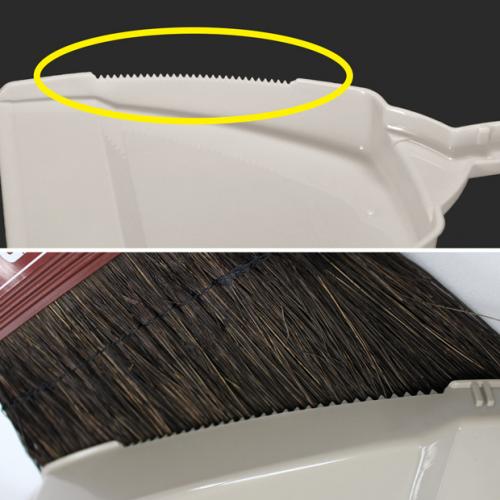チリトリのギザギザ加工を使用すれば、ほうきについたホコリをすばやく落とすことができます。