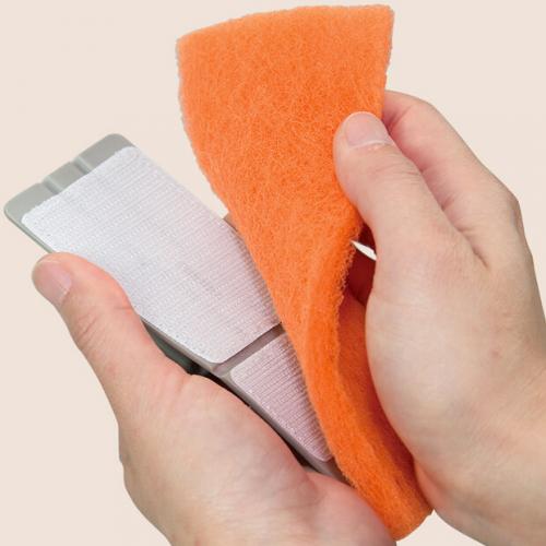 ②上図のように装着し、清掃面(汚れ)をこすってください。グリップを外し、研磨布のみで使用することもできます。