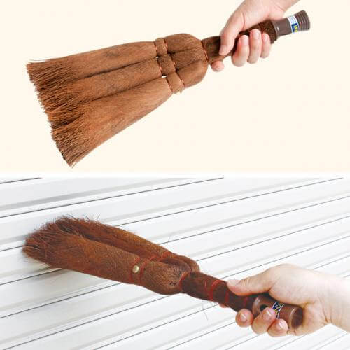 穂にはコシのやわらかい天然繊維の棕櫚ほうきを採用しています。建材を傷つけにくく、角にもやさしくフィットしてホコリやススを払い落とせます。