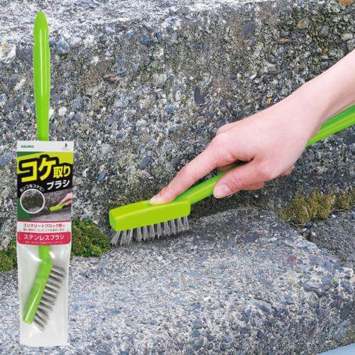 ステンレスの硬めのブラシがコンクリート・石などの硬い素材についたコケをすばやくこすり落とします。