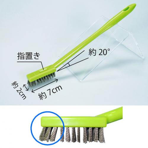 ブロックの目地などのほそい部分や角など、こまかい部分へ使用することを考え、ブラシ幅を細く(幅約2cm)、ブラッシングにチカラがかかりすぎない奥行き(約7cm)にしました。ミゾに入りこんだ根深いコケをかき出すために、ブラシの先端を前に出すよう斜めに植毛し、壁面・床面共に使用やすい柄の角度(約20°)に設定。力を入れて使用したい時にヘッドが握れる指置き付きで、広い面のお掃除でも疲れにくい形状です。