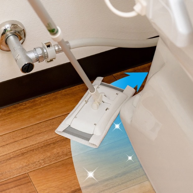 便器まわりの床は尿が垂れたりと時に汚れやすい場所。パッドの側面がカーブしているので便器の曲線と床のキワまでしっかりお掃除できます。