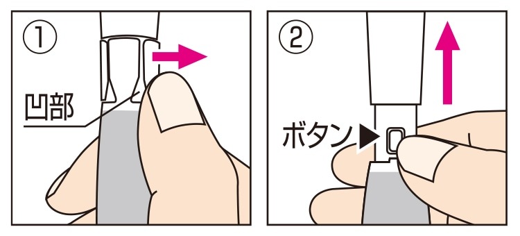 [1]図のように固定リングとグリップの凹部に指先をかけ、固定リングを広げて外します。