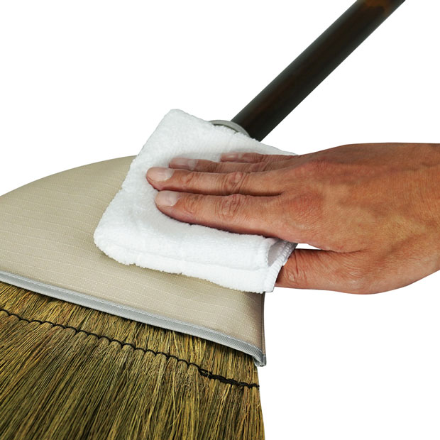 大工さんや職人さんは現場で座敷ほうきをお使いになられます。軽トラックに大工道具と座敷ほうきを一緒に積み込んで移動される際、座敷ほうきの柄(木柄や竹柄)が折れてしまうことがあるそうです。そのような声を頂き、この製品を開発いたしました。ヘッドと柄が取り外せるので、持ち運びに便利で、柄には折れにくいスチール柄を採用しました。穂には、現場での仕上げ作業をよりすっきりとした気持ちで終えていただけるよう、ホコリ、砂等の細かいゴミまでしっかり掃けるしなやかな「かや草」を採用しました。また汚れやすい使用環境を考慮し、お手入れしやすいポリウレタン加工のカバーを使用しました。プロフェショナルなほうきを是非お使い頂ければと思います。