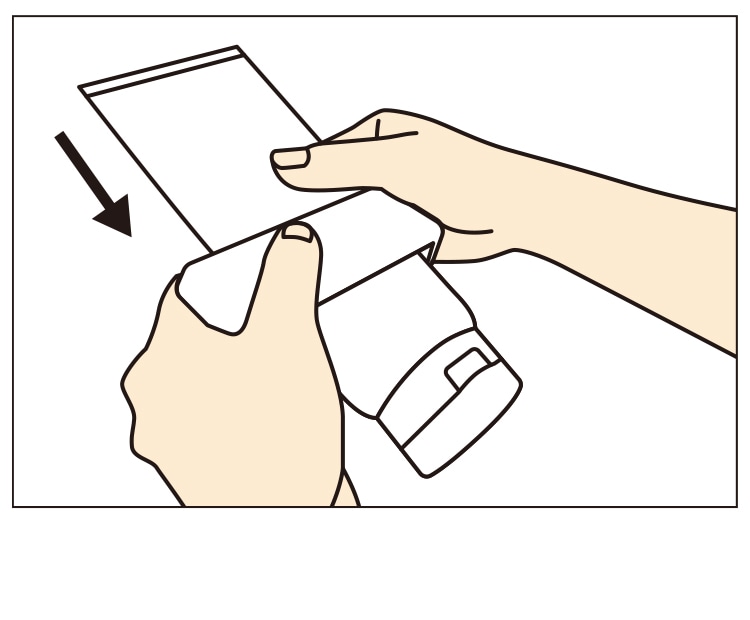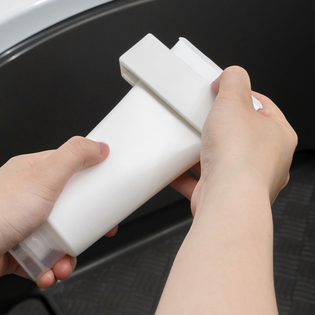 図のように本体をチューブ容器の口に向かってゆっくりと押し、中身を絞ります。