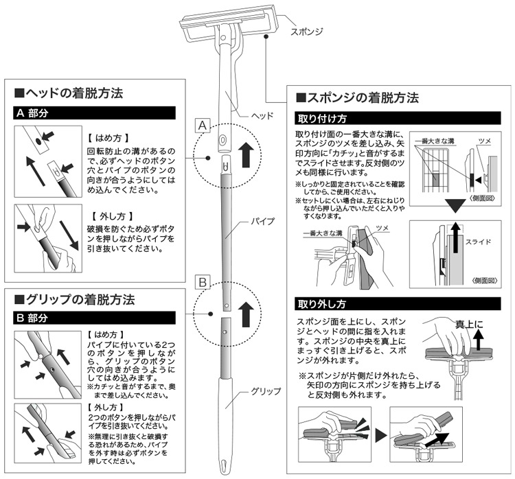 ※スポンジを本体から外して絞る際、ねじって絞ると破損の原因となるため、手の平で押さえつけるように絞ってください。