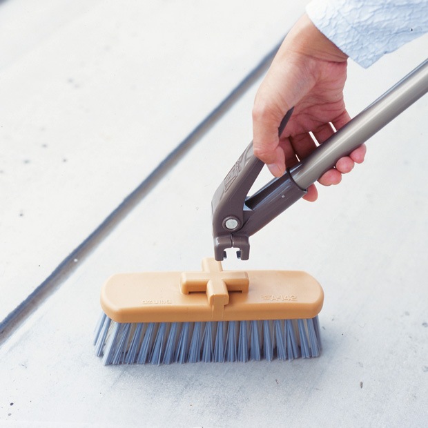 デッキブラシのヘッドの向きを縦横に変えれば、狭い場所のお掃除もできるという、画期的なアイデアが出て開発しました。開発時は女性でも簡単にヘッド交換ができ、さらに作業の際にはヘッドがしっかりと固定され簡単に抜け落ることがない仕様にするのが大変でした。外しやすく、それでいてしっかりと固定するという相反する条件を満たすために、多くの試作品を経てこちらの商品が完成しました。