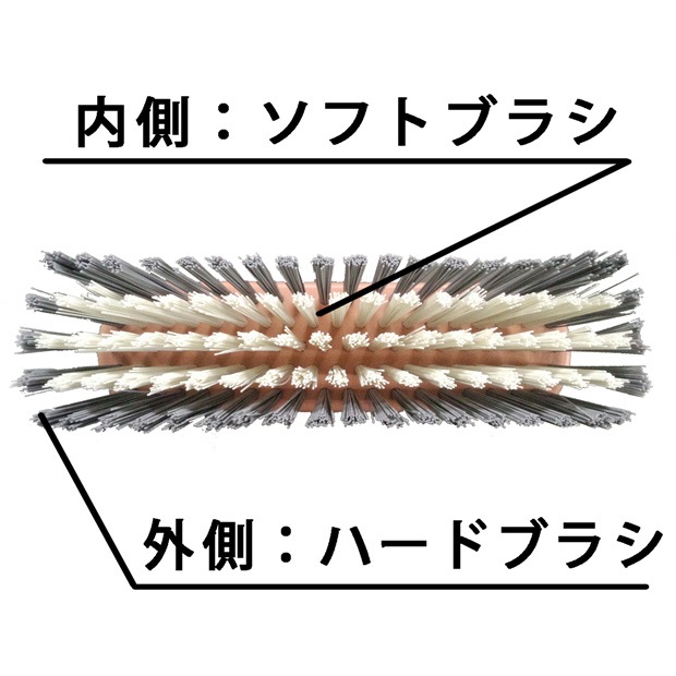 内側にはソフトタイプ、外側にはハードタイプの2種類のブラシを配置しました。外側のハードブラシがスミの汚れや頑固な汚れをかき出し、内側のソフトブラシが細かな汚れを洗い落とします。2種類のブラシにしたことで、効率よく力を清掃面に伝え、使用感を上げています。