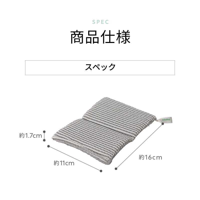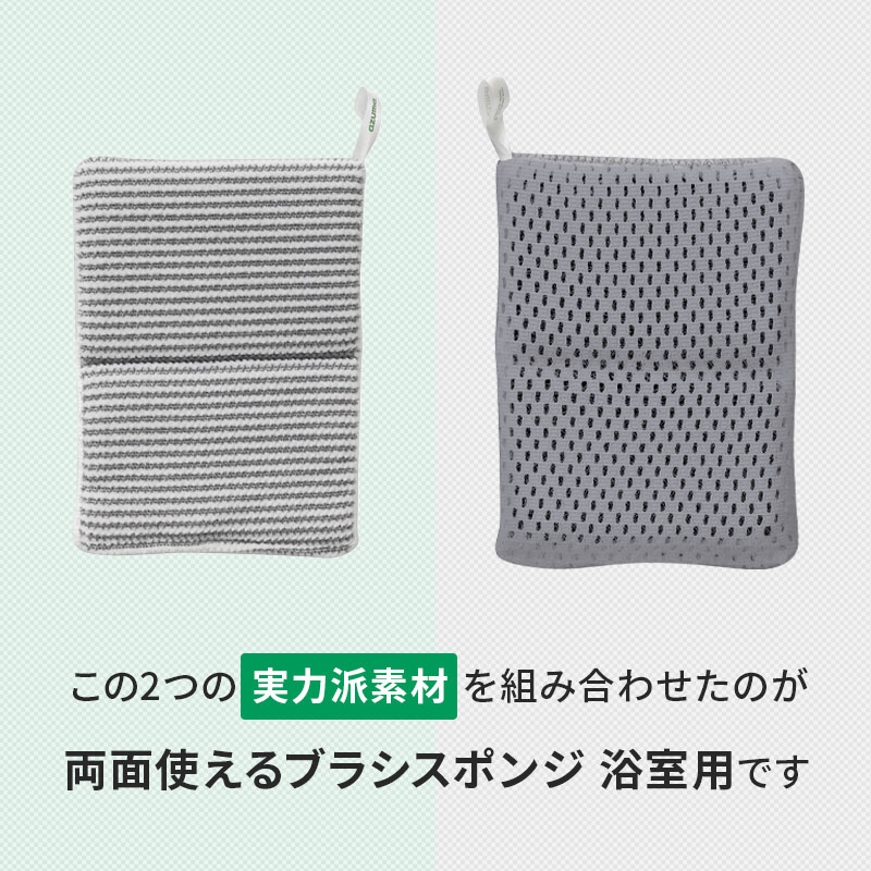 隠れ人気商品の「浴室まるごとブラシスポH」は、床も浴槽も洗える便利なアイテムでしたが、厚手の構造で細かいすき間や曲面の掃除が難しいという声もありました。 そこで、すみずみまで洗えるよう「2つ折りタイプ」の形状を採用。手で挟んで使えることで、浴槽のフチやシャワーホース、ドアのすき間も洗いやすくなりました。 さらに、アズマの人気素材「W繊維」と「ツンツンブラシ」――2つの“アズマブラシ”を組み合わせた構造はそのままに、より細かい部分にも届く、扱いやすい形にしました。 握りやすいサイズ感にもこだわり、手の小さな方でも扱いやすくなるよう工夫しています。 また、色味も従来の緑色と黄色のカラーリングから、より浴室になじみやすいグレーのシンプルカラーへと一新。出しっぱなしでも生活感が出にくく、空間になじむデザインになりました。 毎日のお風呂掃除を、もっと手軽に、もっと気持ちよく。そんな想いから生まれたのが、「両面使えるブラシスポンジ 浴室用」です。