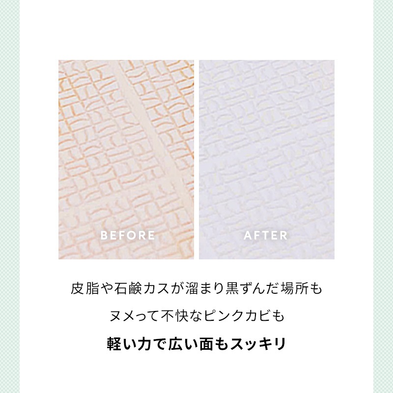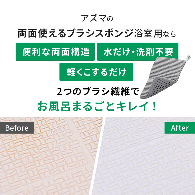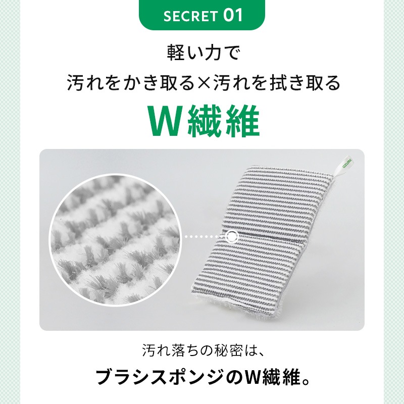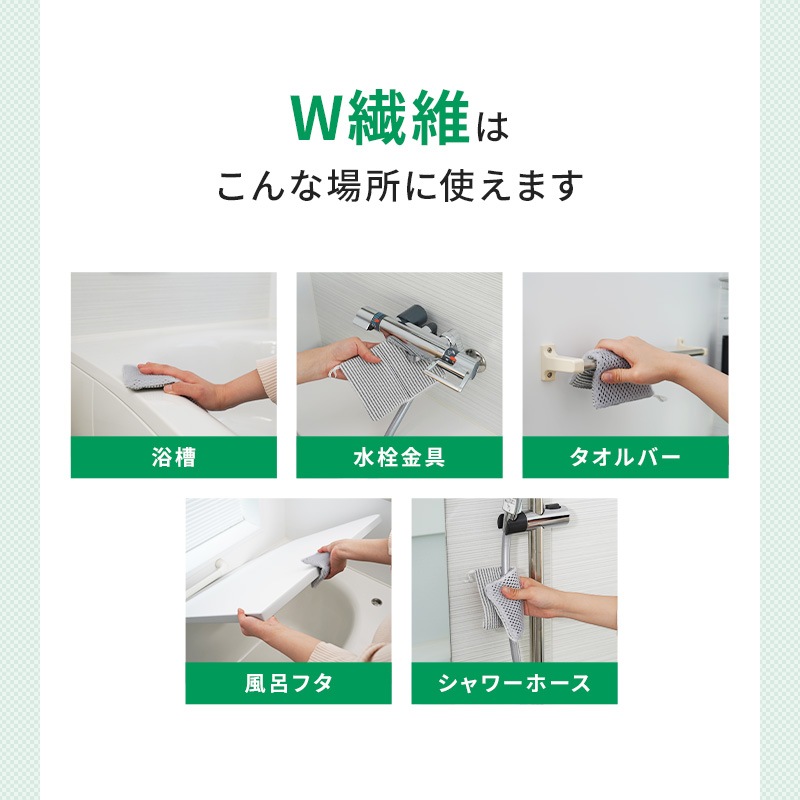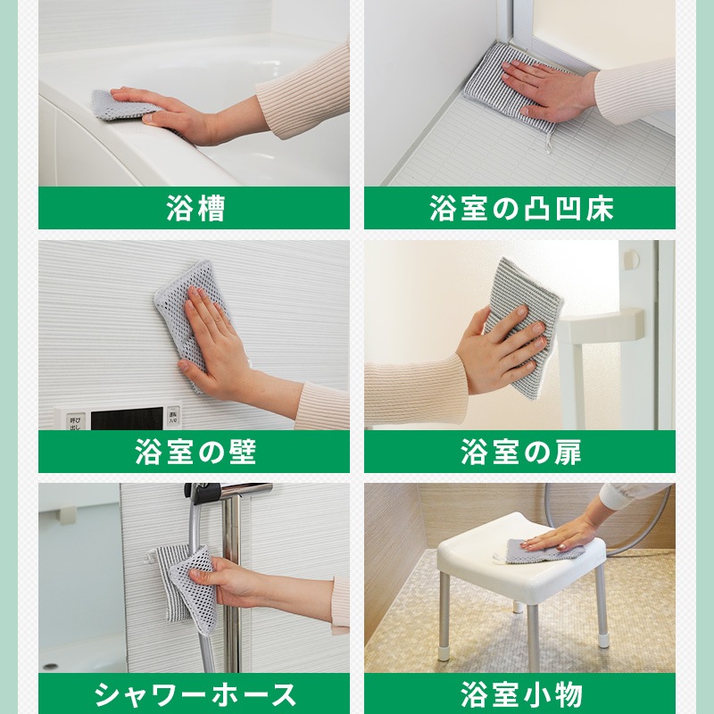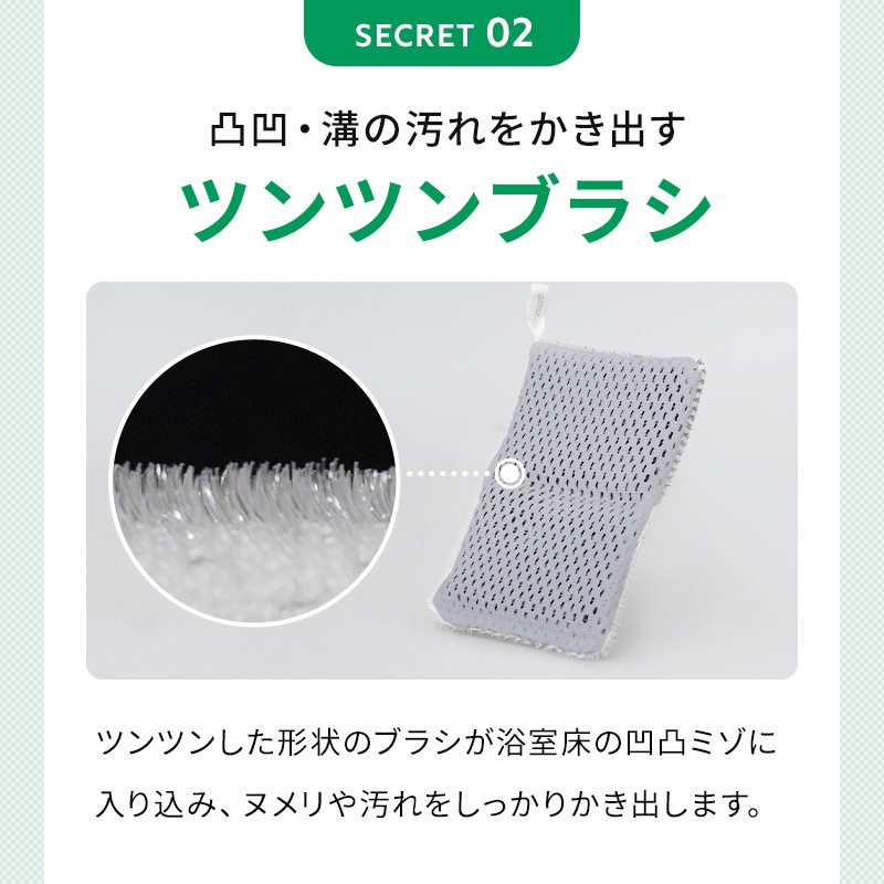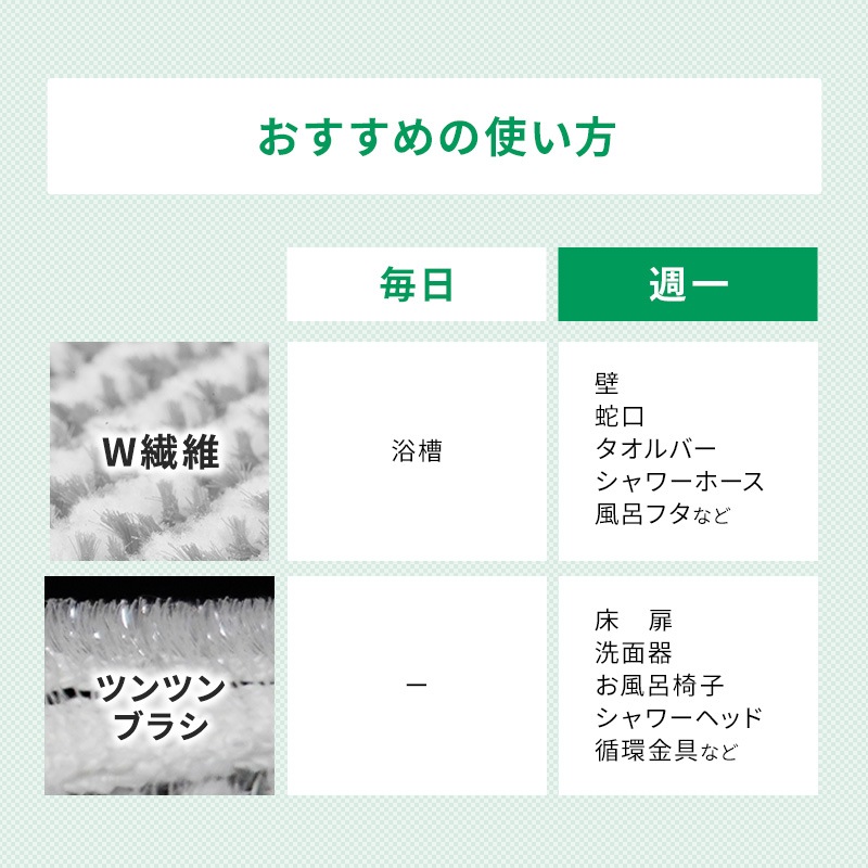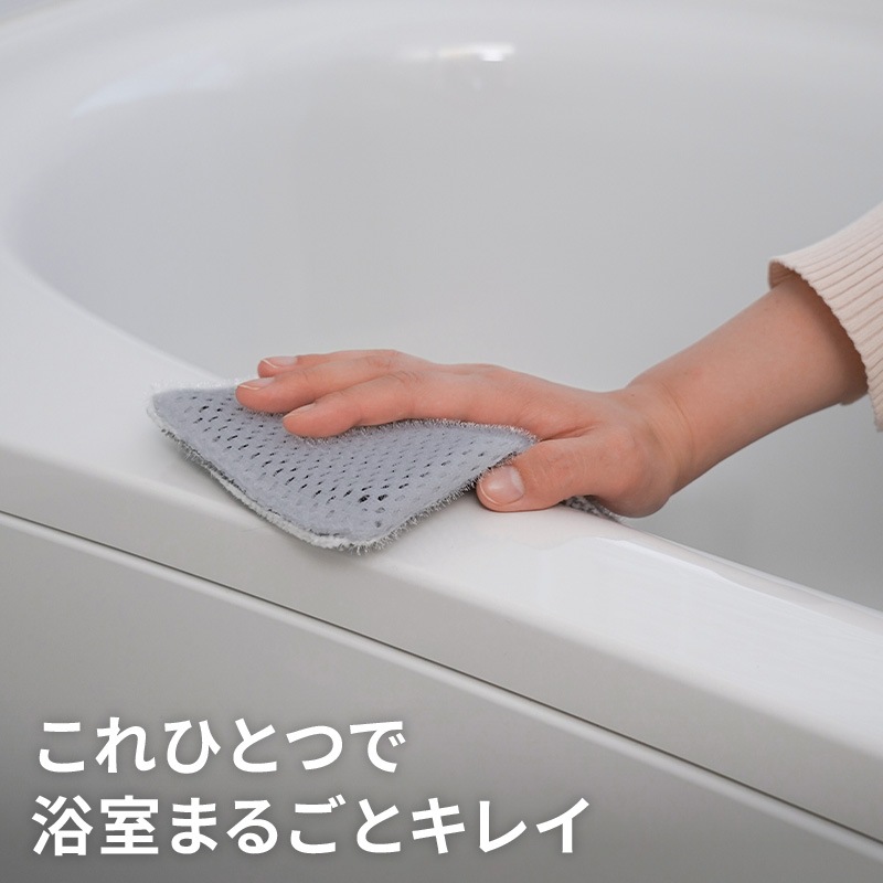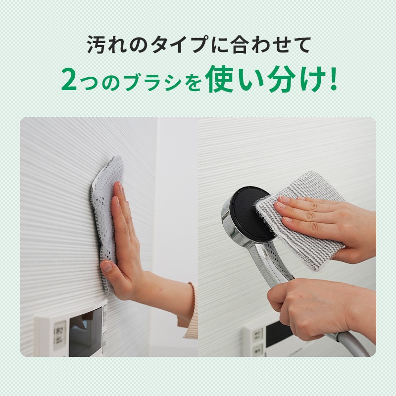 グレーのブラシ繊維が清掃面の汚れをかき取り、白色の吸着繊維が浮いた汚れを拭き取ります。 浴槽・浴室の壁・水栓金具・タオルバー・風呂フタ・シャワーホースなどに。