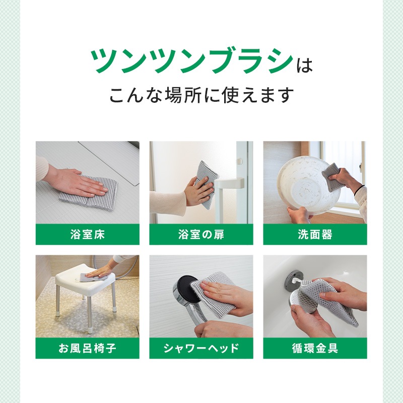 ツンツンした形状のブラシが浴室床の凸凹ミゾに入り込み、ヌメリや汚れをしっかりかき出します。 浴室床・浴室の扉・洗面器・お風呂椅子・シャワーヘッド・循環金具などに。