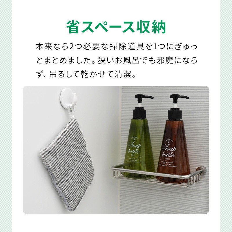 本来なら2つ必要な掃除道具を1つにぎゅっとまとめました。 狭いお風呂でも邪魔にならず、吊るして乾かせて清潔。
