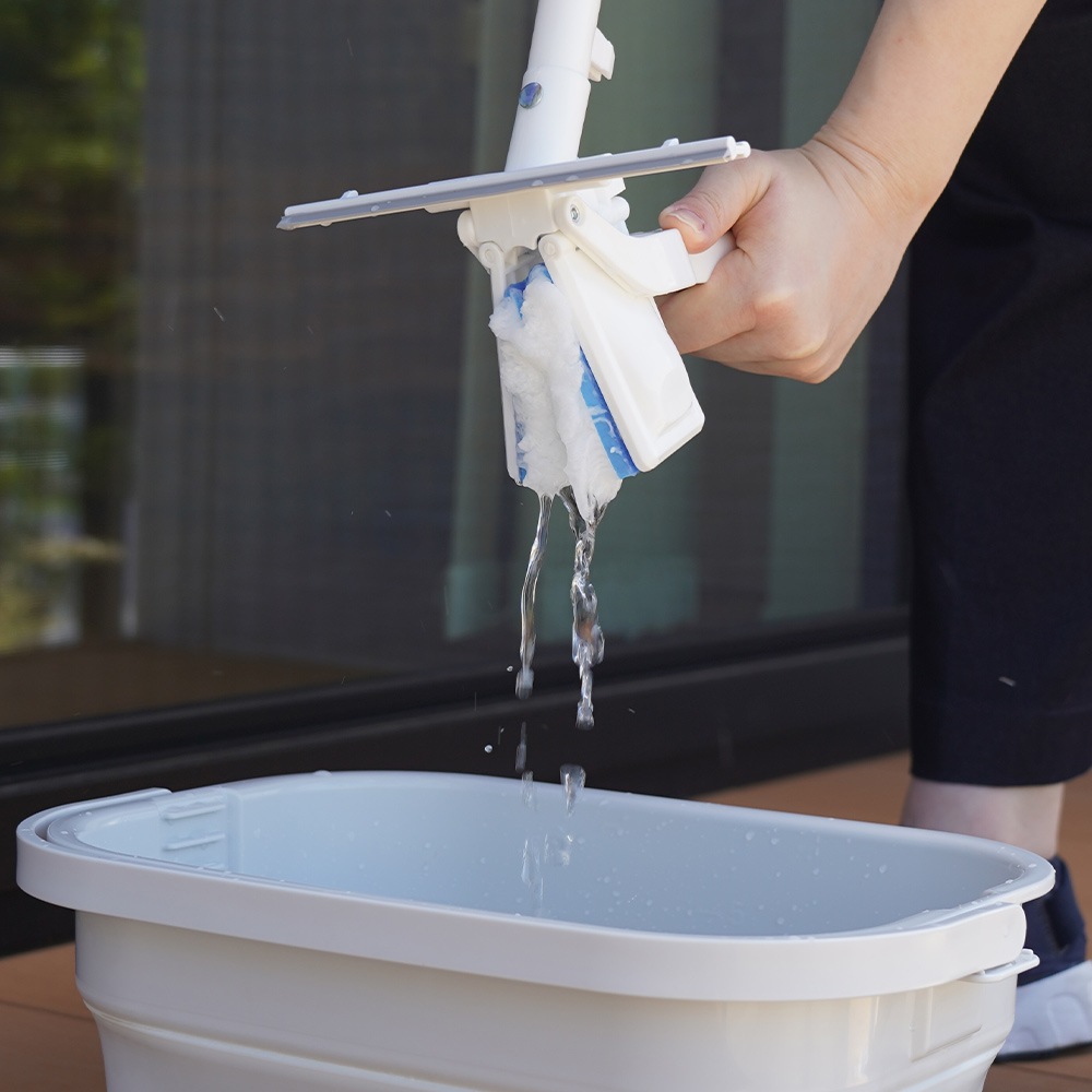 拭き幅は約18cm。他の窓用ワイパーに比べて小さ目ですが、その分しっかりフィットして均一にお掃除できます。また、通常の丸型バケツに入るサイズなので、モップの洗浄も簡単にできます。