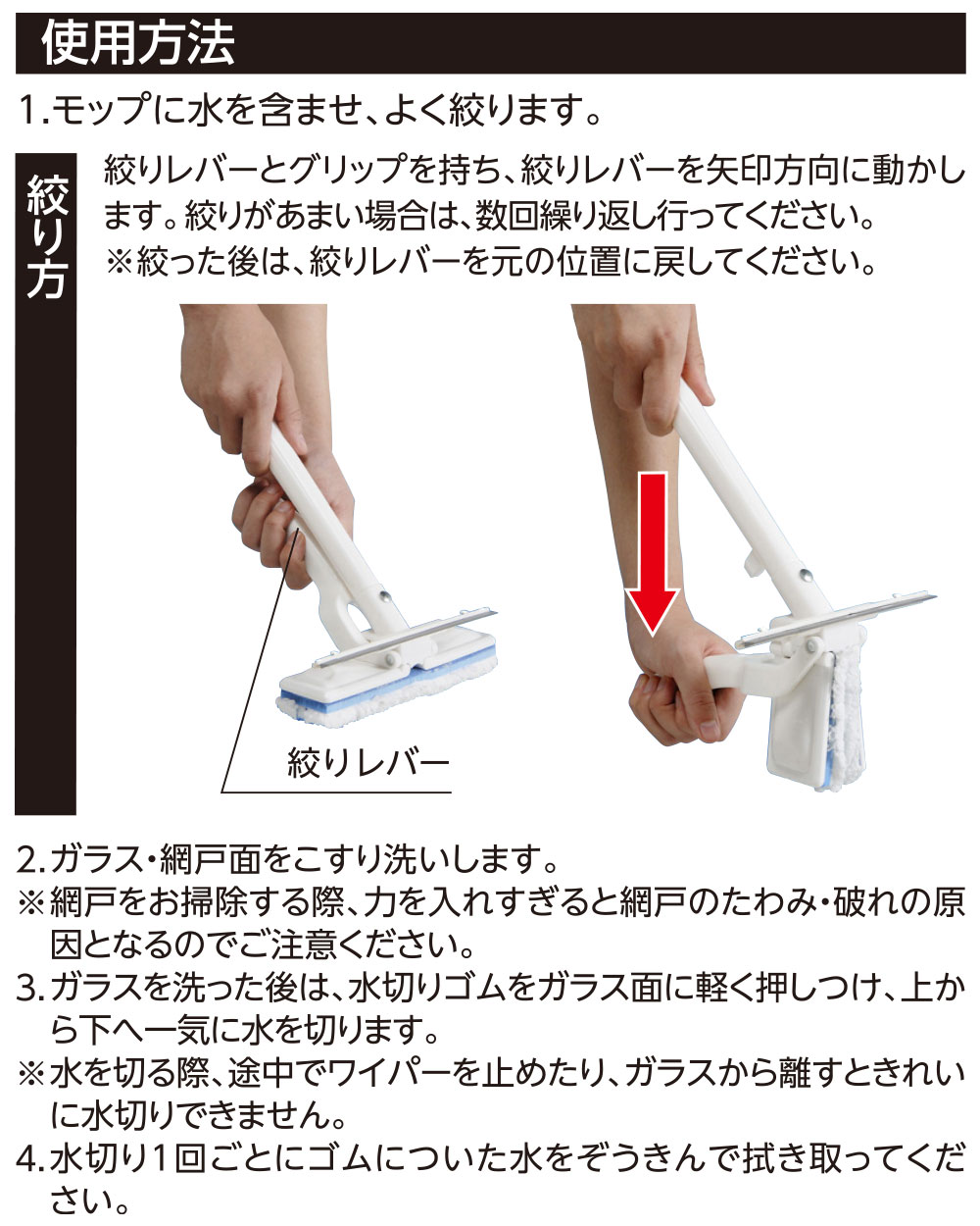 ・水切りゴムが劣化するため、洗剤を使用した際は、清掃面を水でよく洗い流してから水切りしてください。また、使用後は本体を水でよく洗い流してください。