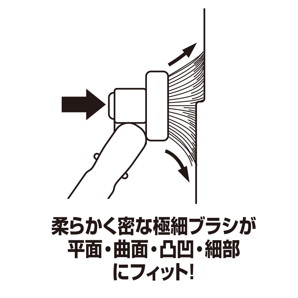 柔らかい極細毛を密に植毛したブラシが清掃面(平面・曲面・凸凹・細部等)にフィット。