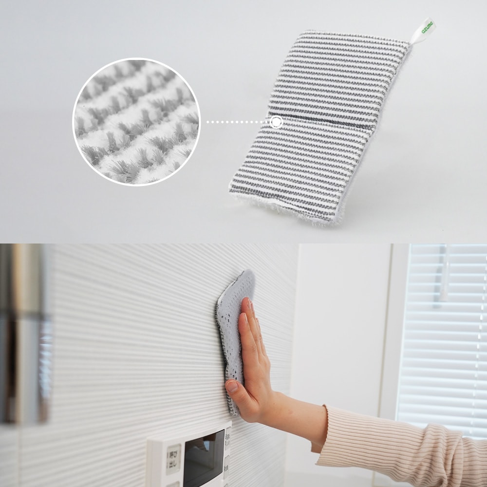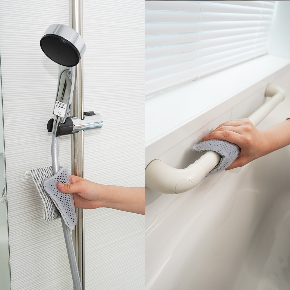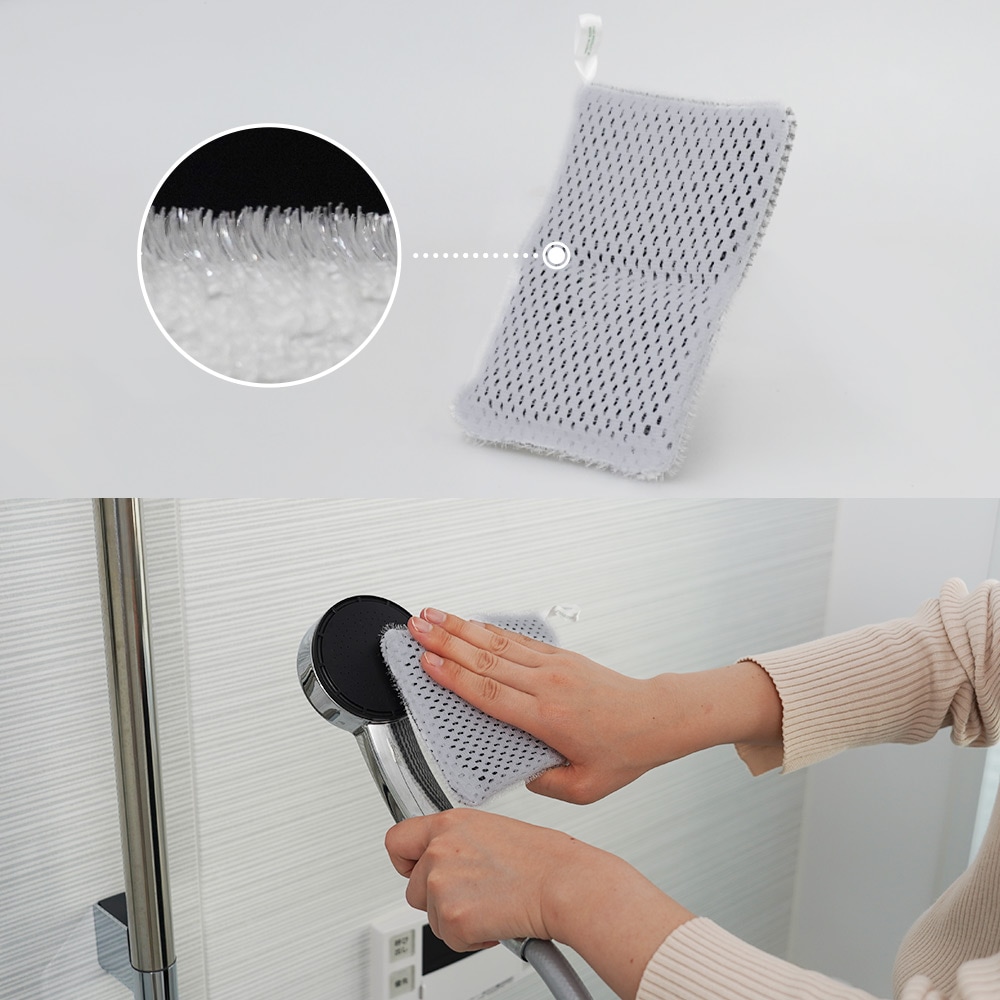 グレーのブラシ繊維が清掃面の汚れをかき取り、白色の吸着繊維が浮いた汚れを拭き取ります。 浴槽・浴室の壁・水栓金具・タオルバー・風呂フタ・シャワーホースなどに。