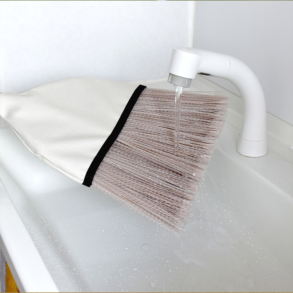 化学繊維は水に強いため、汚れたら水洗いが可能。水洗いしたら風通しの良い場所で穂を下にし、吊るして乾燥してください。