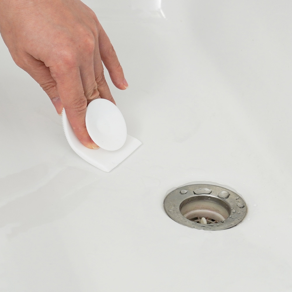 [2] 上図のように吸盤を指で挟み、ブラシ面で洗面台を軽くこすり洗いします。