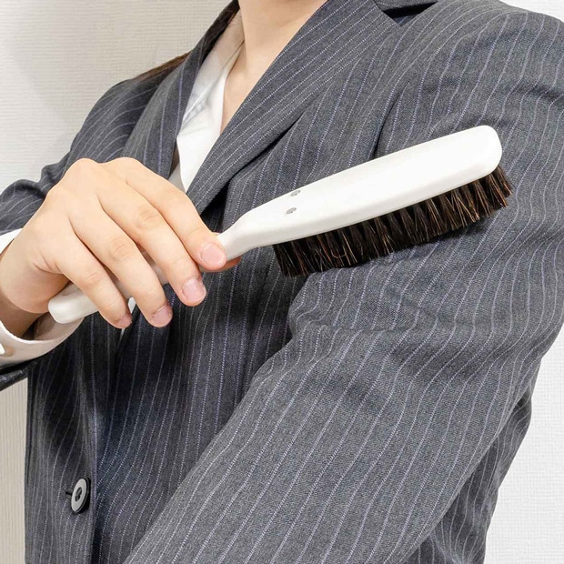 ホコリや花粉がついたスーツやコートをサッと払えてピタッと収納できる洋服ブラシです。 日頃の衣類のケアに。